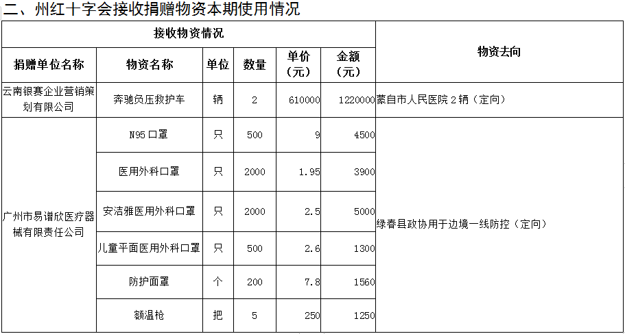 所接收的捐赠款物有捐赠意向的按捐赠方意向安排,无捐赠意向的由州、县(市)疫情防控指挥部统筹安排使用。具体情况如下: