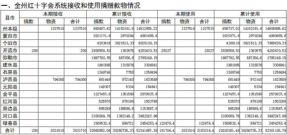 其中,州红十字会于2020年5月29日18时至6月12日18时期间,接收新冠肺炎疫情防控社会捐赠款物价值1237510元(捐款0元、捐赠物资价值1237510元),使用捐赠款物价值1237510元(捐款0元、捐赠物资价值1237510元)。累计接收新冠肺炎疫情防控社会捐赠款物价值14812659.22元(捐款660497.62元、捐赠物资价值14152161.6元),累计使用捐赠款物价值14808898.62元(捐款656737.02元、捐赠物资价值14152161.6元)。