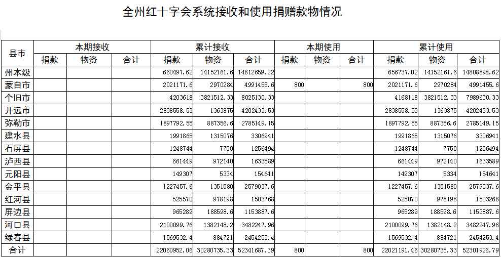 2020年6月12日18时至6月19日18时,红河州红十字会系统接收新冠肺炎疫情防控社会捐赠款物价值0元,使用捐赠款物价值800元(捐款800元、捐赠物资价值0元)。累计接收新冠肺炎疫情防控社会捐赠款物价值52341687.39元(捐款22060952.06元、捐赠物资价值30280735.33元),累计使用捐赠款物价值52301926.79元(捐款22021191.46元、捐赠物资价值30280735.33元)。