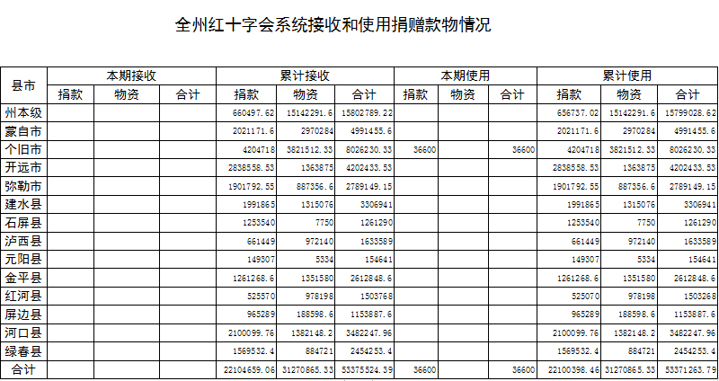 2020年8月21日18时至9月6日18时,红河州红十字会系统接收新冠肺炎疫情防控社会捐赠款物价值0元,使用捐赠款物价值36600元(捐款36600元、捐赠物资价值0元)。累计接收新冠肺炎疫情防控社会捐赠款物价值53375524.39元(捐款22104659.06元、捐赠物资价值31270865.33元),累计使用捐赠款物价值53371263.79元(捐款22100398.46元、捐赠物资价值31270865.33元)。