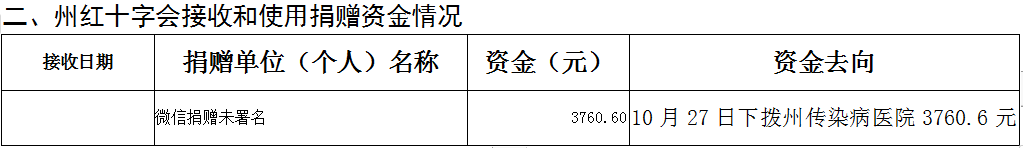 其中,州红十字会于2020年9月20日18时至11月1日18时期间,接收新冠肺炎疫情防控社会捐赠款物价值0元,使用捐赠款物价值3760.6元(捐款3760.6元、捐赠物资价值0元)。累计接收新冠肺炎疫情防控社会捐赠款物价值15802789.22元(捐款660497.62元、捐赠物资价值15142291.6元),累计使用捐赠款物价值15802789.22元(捐款660497.62元、捐赠物资价值15142291.6元)。