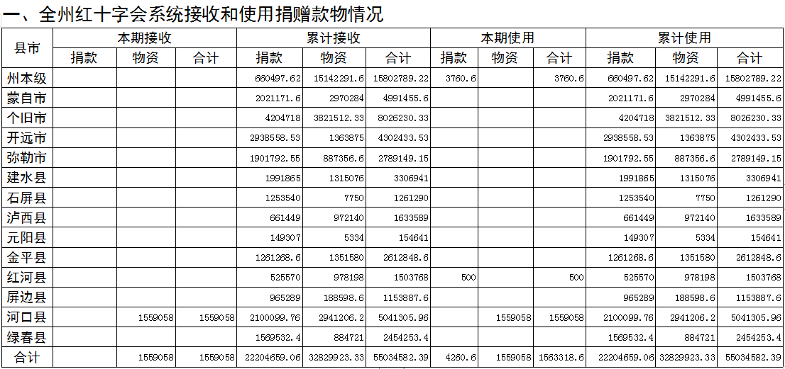2020年9月20日18时至11月1日18时,红河州红十字会系统接收新冠肺炎疫情防控社会捐赠款物价值1559058元(捐款0元、捐赠物资价值1559058元),使用捐赠款物价值1563318.6元(捐款4260.6元、捐赠物资价值1559058元)。累计接收新冠肺炎疫情防控社会捐赠款物价值55034582.39元(捐款22204659.06元、捐赠物资价值32829923.33元),累计使用捐赠款物价值55034582.39元(捐款22204659.06元、捐赠物资价值32829923.33元)。