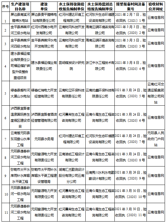 根据《水利部关于加强事中事后监管规范生产建设项目水土保持设施自主验收的通知》(水保〔2017〕365号)、《云南省水利厅转发水利部关于加强事中事后监管规范生产建设项目水土保持设施自主验收文件的通知》(云水保〔2017〕97号)的有关规定,2021年1-3月我局接受了11个生产建设项目水土保持设施自主验收报备,现将有关情况予以公告。