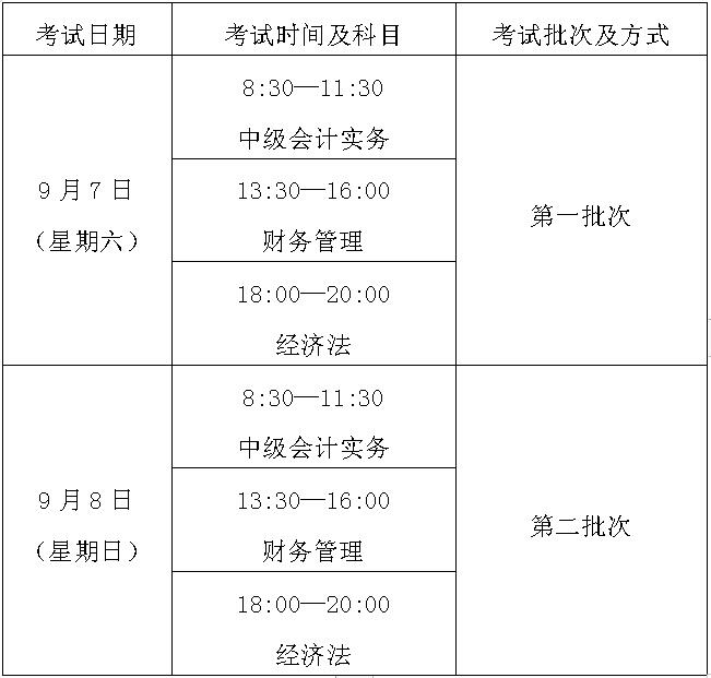 中级资格考试于2019年9月7日—8日举行,共两个批次。具体考试时间如下: