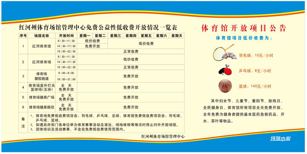 红河体育馆室内全年免费或低收费开放,开放天数达360天以上,低收费开放时段为:每天上午8:30—11:30,下午14:30—17:30。其中,星期一、星期二下午14:30—17:30为免费开放时段,妇女节、儿童节、重阳节、助残日、全民健身日全天免费开放。全年免费为健身者提供基本医药急救药品、开水、茶叶等物品。