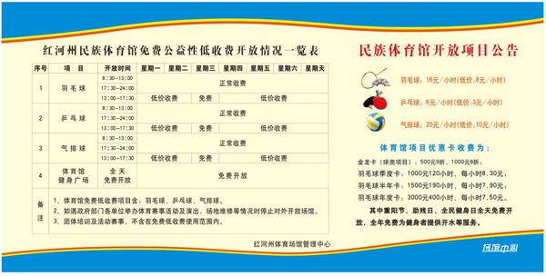 红河州民族体育馆室内全年免费或低收费开放,开放天数达360天以上,低收费开放时段为:每天13:00—17:30。其中,星期三13:00—17:30为免费开放时段,重阳节、助残日、全民健身日全天免费开放。全年免费为健身者提供基本医药急救药品、开水、茶叶等物品。