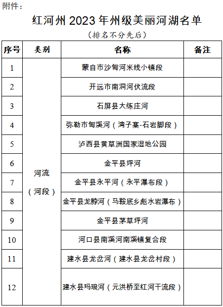 根据《云南省河长制办公室关于开展2023年省级美丽河湖申报工作的通知》(云河长办发〔2023〕72号)、《红河州美丽河湖建设行动实施方案(2019-2023年)》(红河州总河长令第5号)等要求,经县级自评、州级复核,拟确定下列12条河流(河段)、17个湖泊(水库、水利风景区)为红河州2023年度美丽河湖(详见附件),现予公示,接受社会公众监督。如有异议请在公示期内以来信、来电等形式反映至州河长办,单位反映情况须加盖公章,个人反映情况应署真实姓名,并留下真实的联系电话、地址、邮编。