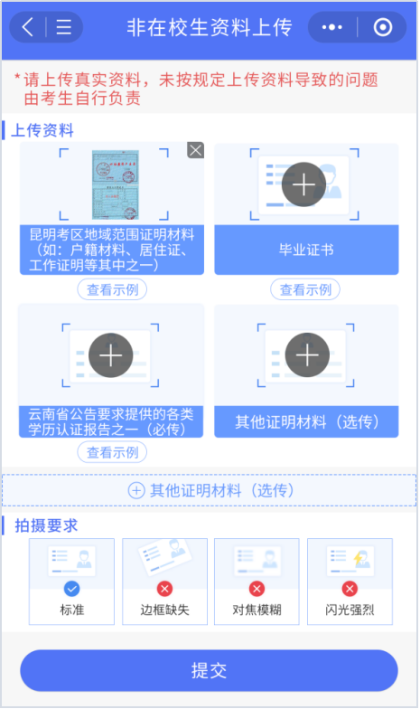 非在校生:请上传红河考区域范围证明材料(如户籍材料、居住证、工作证明等其中之一)、毕业证书,以及云南省公告要求提供的各类学历认证报告之一。