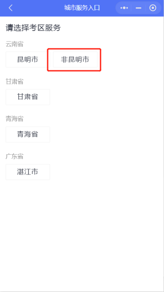 2.在证照家首页点击“教师资格面试审核”后在城市选择入口页面选择“非昆明市”点击进入