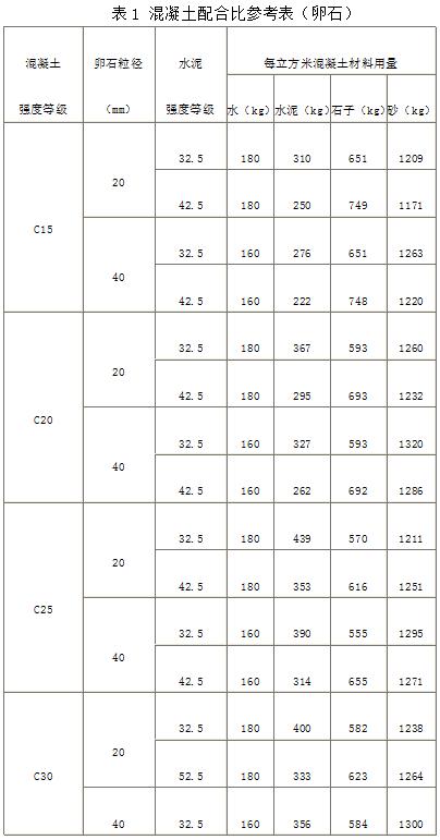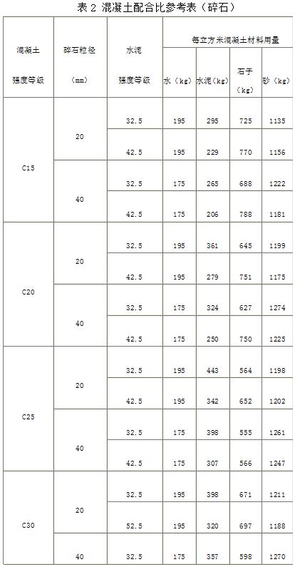 农村建房,多是采用现场自拌混凝土,要严格保证拌合料所用的砂、石、水泥及用水量达到配合比的要求,尤其是单方混凝土的水泥用量不能太少。农房建设常用的中低强度混凝土的配合比选用可参考表1、表2。表中给出的配合比相对应的混凝土塌落度为35~50mm。