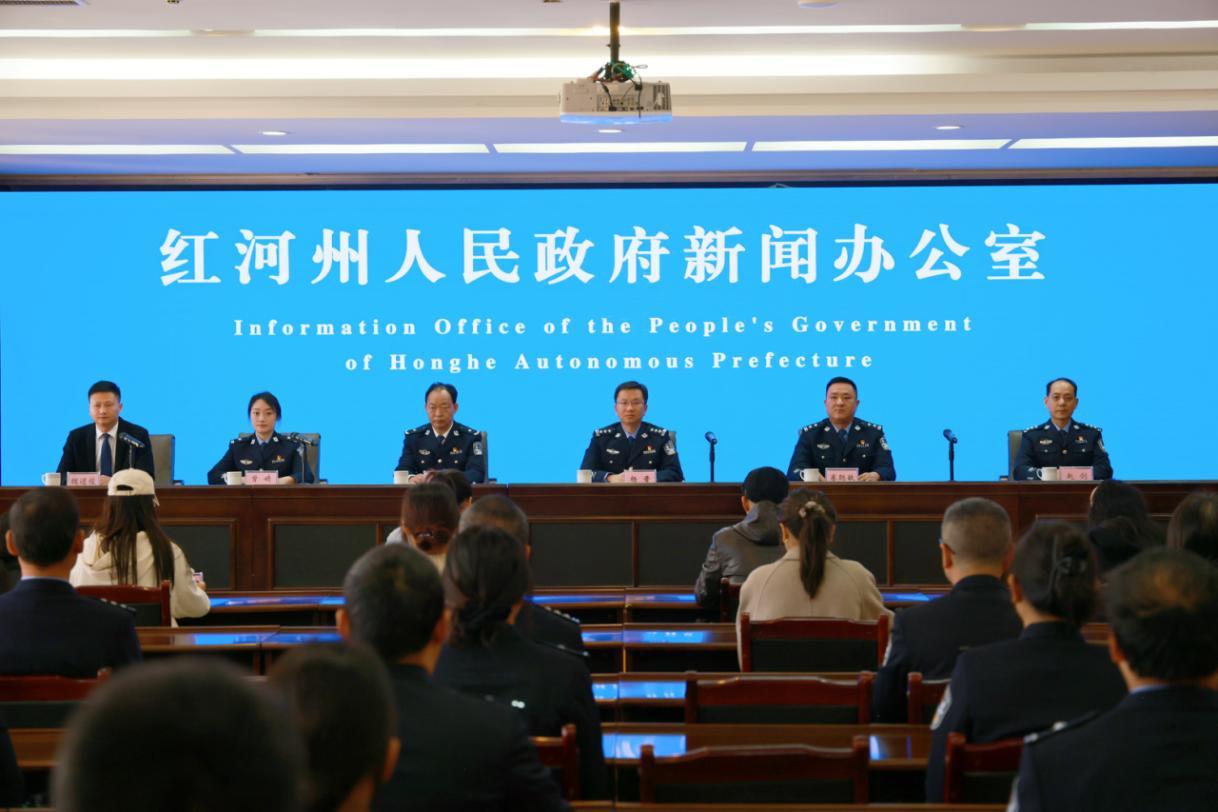 欢迎出席红河公安服务高质量发展新闻发布会。为深入贯彻落实习近平总书记考察云南重要讲话精神,进一步以公安赋能助力全州经济社会高质量发展,红河州公安局出台《红河州公安机关服务高质量发展“警务包”套餐若干措施》,聚焦营商环境优化、民生服务提质、边境安全筑牢、产业发展护航等关键领域精准发力。今天,我们邀请到红河州公安系统的相关负责同志,向大家介绍2025年全州公安工作成效和服务经济社会高质量发展的相关情况,并就记者朋友们关心的问题回答记者提问。