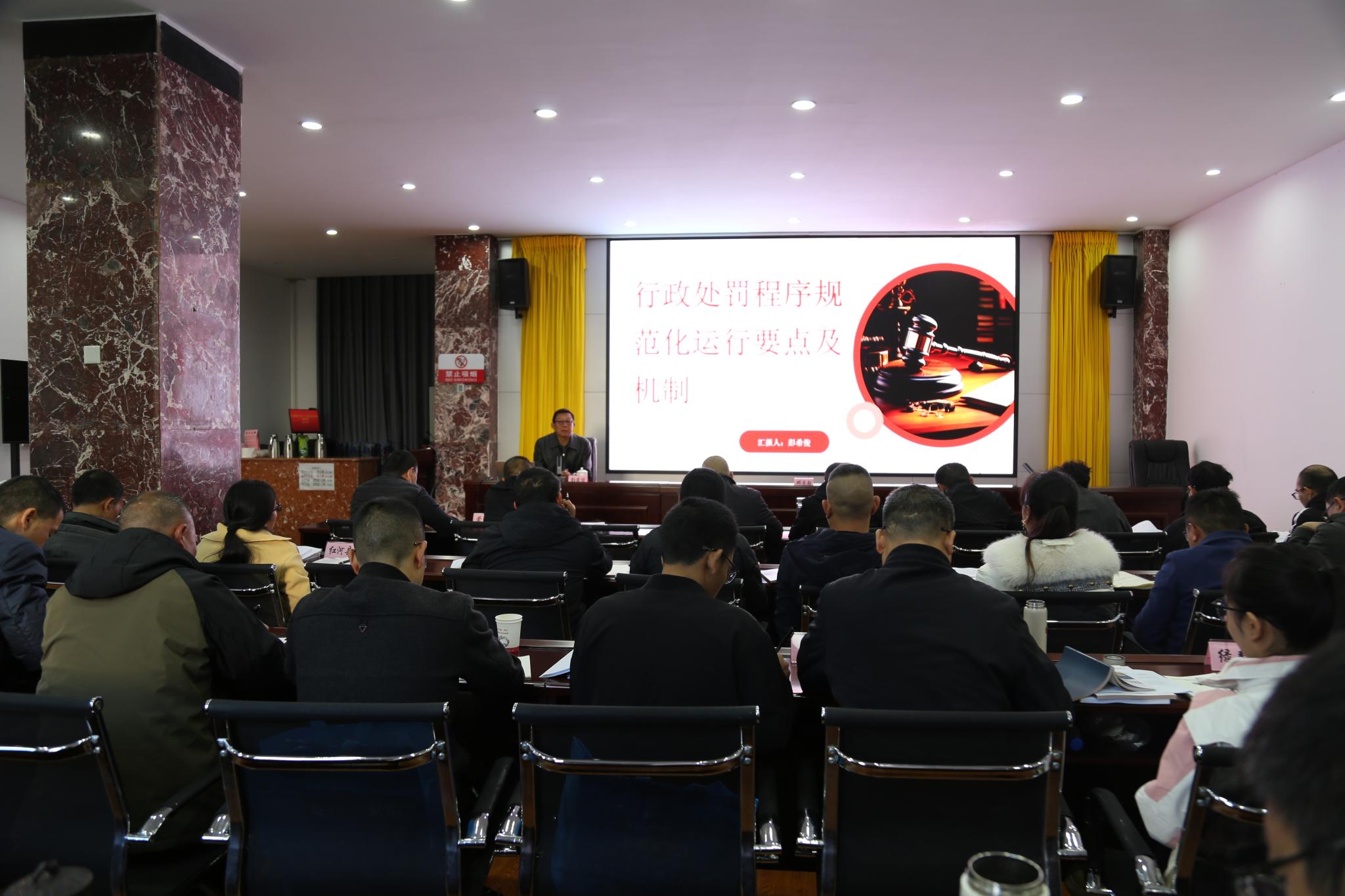 此次培训由红河州民族宗教委党组成员、副主任邓志毅主持,邀请省法学会会员、红河州人民政府第八届法律顾问彭希俊老师给大家进行专题辅导。彭希俊老师结合红河州系统推进我国宗教中国化方向的红河实践,组织学习习近平法治思想,并从行政处罚程序规范化运行要点及机制的角度,深入浅出讲解了法治政府建设的意义、行政处罚规范化的核心环节、规范化的制度保障及民族宗教工作行政执法工作实践对策等,还与大家分享了一些行政执法经验、做法。授课既有理论深度又有实践操作技巧,有效提升了基层宗教工作干部的实际操作能力和水平。