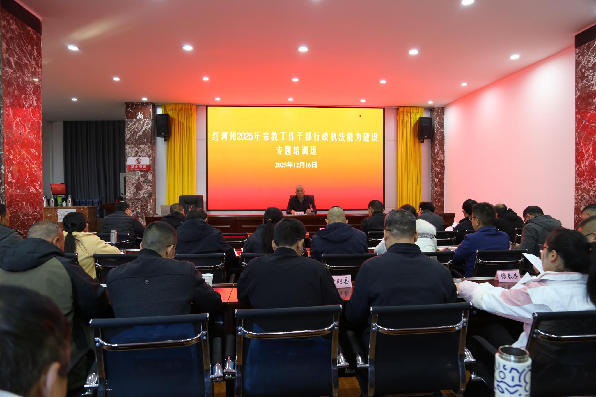12月15日至16日,红河州民族宗教委举办2025年宗教工作干部行政执法能力建设专题培训班。红河州民族宗教委机关、全州13县市民族宗教局分管宗教工作领导和持有行政执法证人员共50余名干部参加培训。