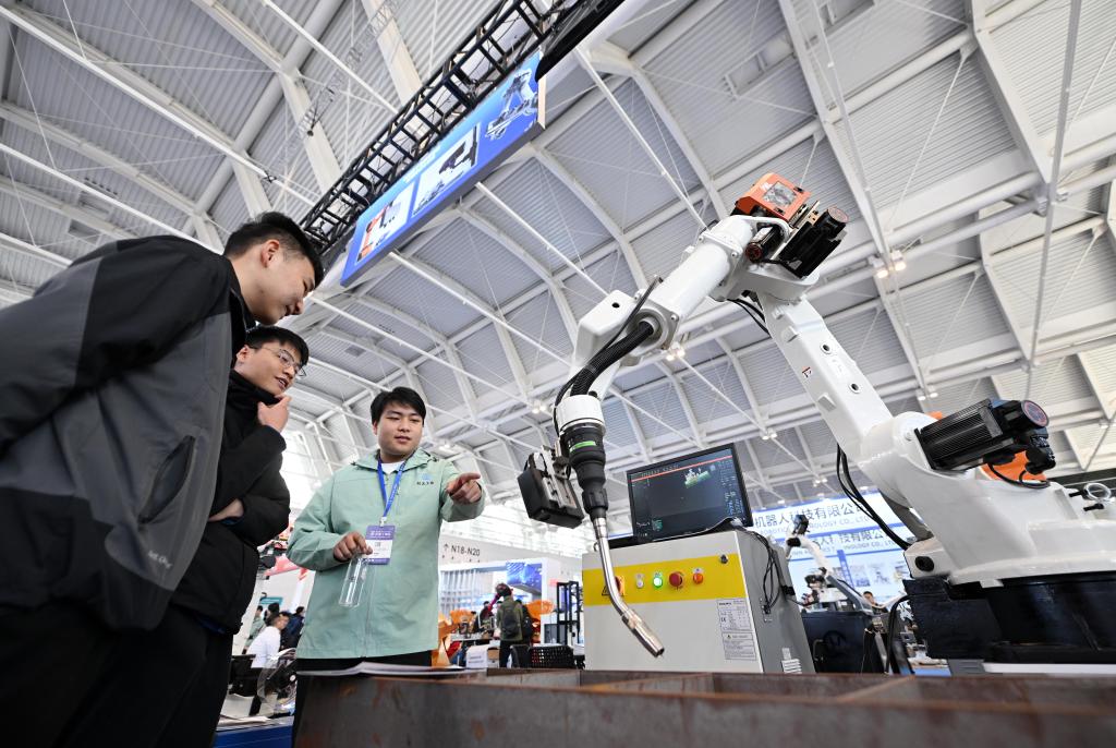 3月6日,第21届中国(天津)国际装备制造业博览会在国家会展中心(天津)开幕,图为观众在天津工博会上参观一款工业机器人。新华社记者 赵子硕 摄