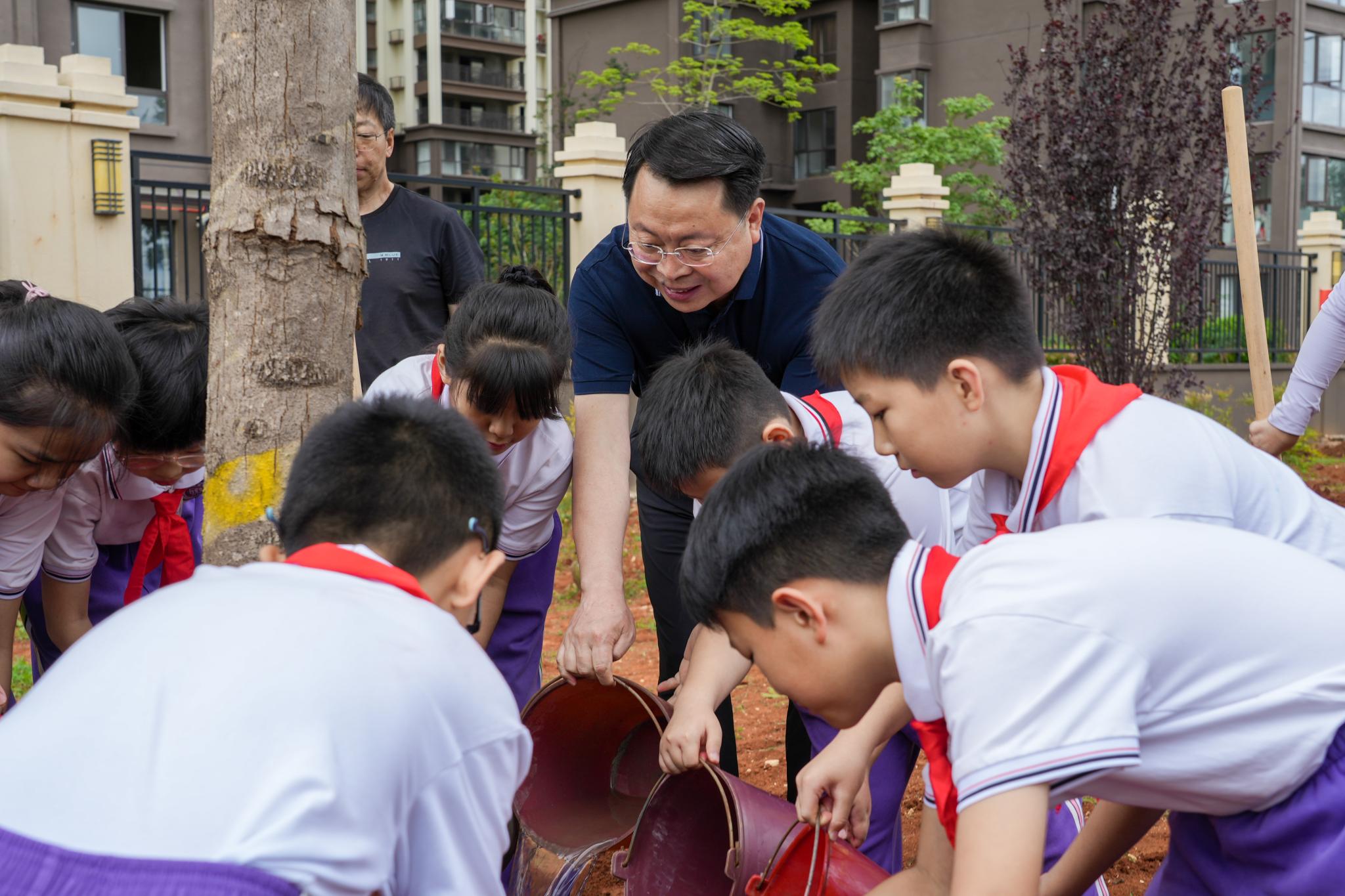 活动现场,大家一起挥锹铲土、提桶浇灌,合力种下树苗,为城市再添新绿。