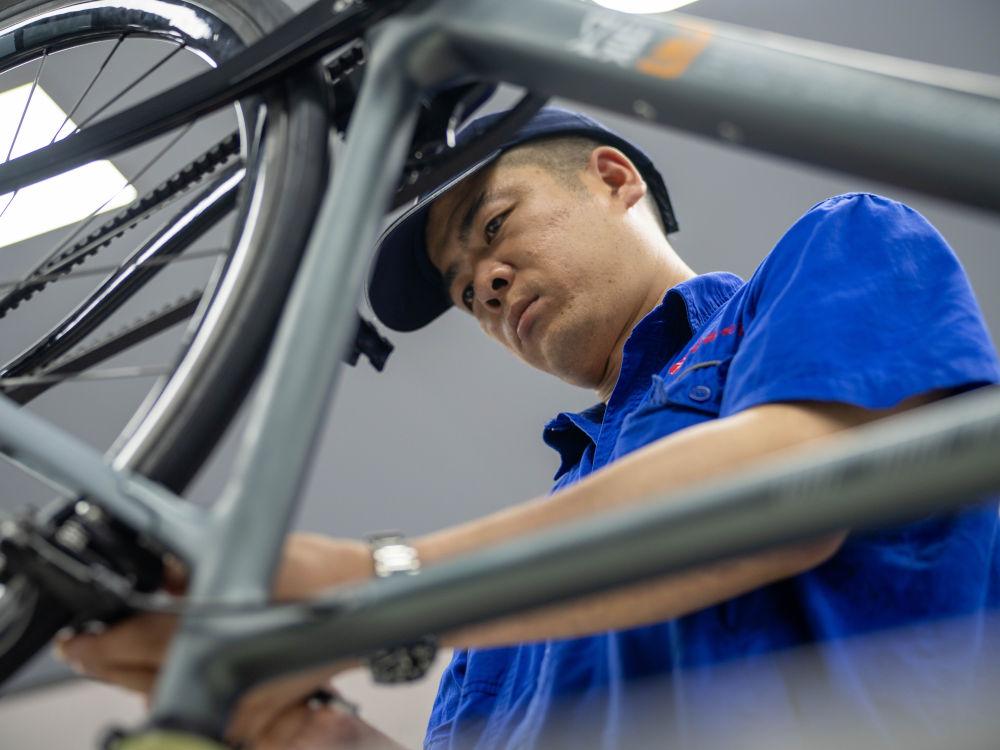 7月16日,在吉林化纤集团复材体育休闲装备产业园,工人组装碳纤维自行车车架。新华社记者 邵泽东 摄