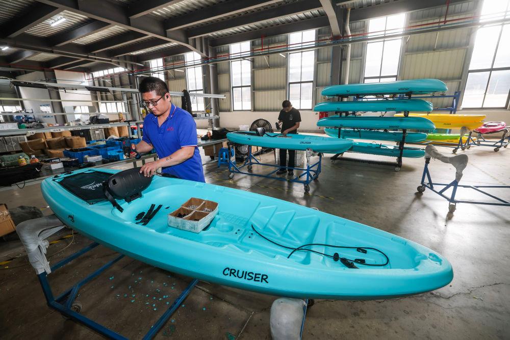 6月25日,在位于慈溪市的浙江酷尔智能科技有限公司的车间内,工人在加工出口的皮划艇。新华社记者 徐昱 摄