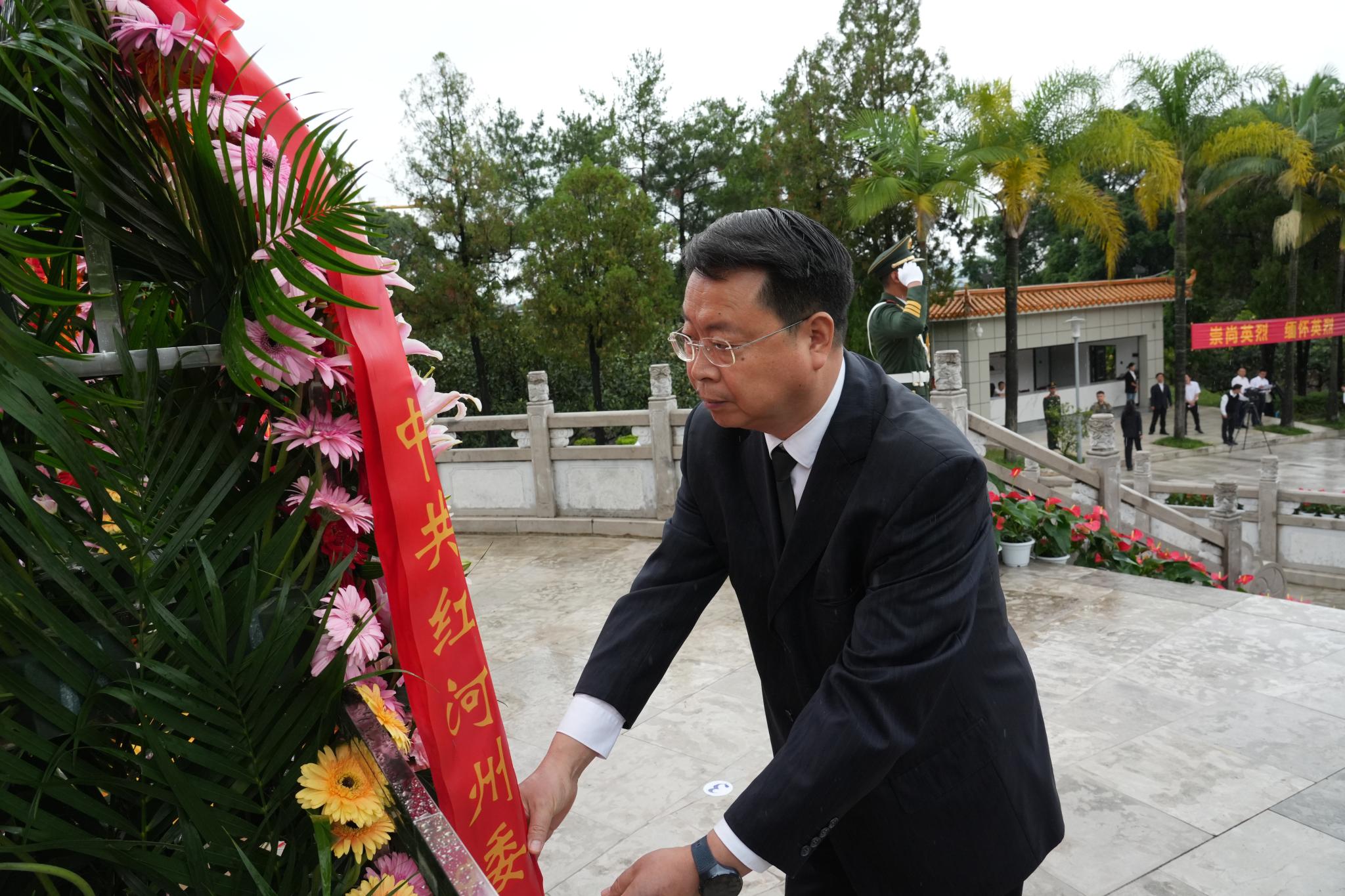 红河州委书记赵瑞君,州委副书记、州长罗萍等党政军领导与各族各界代表共同向烈士纪念碑敬献花篮,缅怀革命先烈。