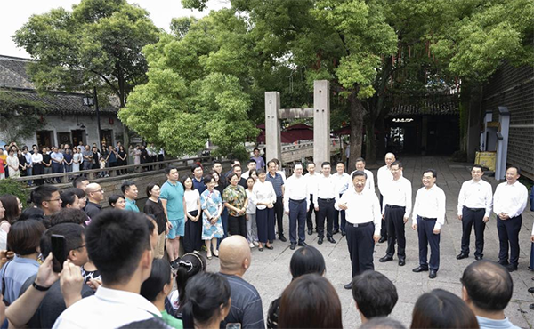 7月5日至7日,中共中央总书记、国家主席、中央军委主席习近平在江苏考察。这是6日上午,习近平在苏州平江历史文化街区,同当地居民和游客亲切交流。新华社记者 燕雁 摄