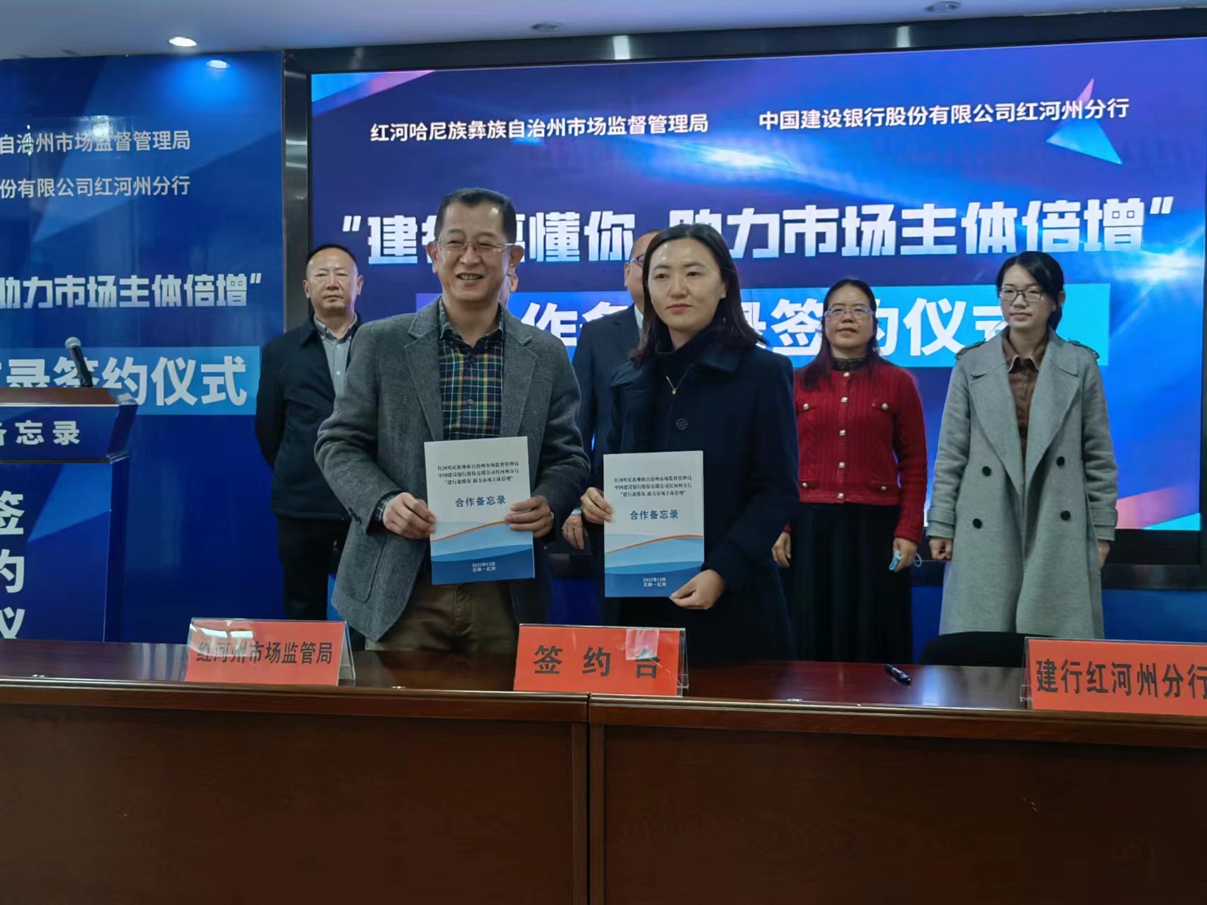 红河州市场监管局与建行红河州分行现场签署《红河哈尼族彝族自治州市场监督管理局 建行红河州分行“建行惠懂你 助力市场主体倍增”合作备忘录》,精准对接小微企业融资服务需求,提升“政务+金融”综合服务质效。