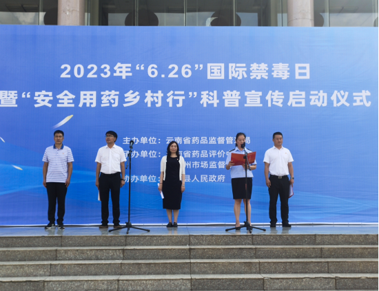 6月26日上午,由云南省药品监督管理局主办的“6·26”国际禁毒日暨“安全用药乡村行”科普宣传活动启动仪式在元阳县人民广场举行。元阳县市场监管和公安部门、医疗机构、药品经营企业参加,开展了义诊、入校宣讲、展板宣传、实物演示、发放宣传资料等活动。