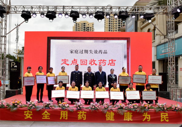 活动中,红河州市场监督管理局有关领导为一心堂14家门店进行了“家庭过期失效药品定点回收药店”授牌。