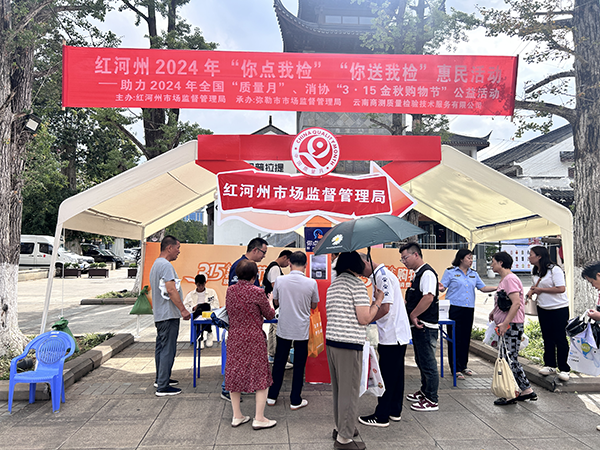 9月13日,2024年云南省“3·15金秋购物节”公益活动暨红河州“质量月”活动在红河州弥勒市红河水乡广场启动。为助力公益活动,迎接中秋佳节、国庆节到来,确保人民群众度过一个安全、祥和的“双节”,红河州市场监管局、弥勒市市场监管局、云南商测质量检验技术服务有限公司在弥勒红河水乡广场联合开展2024年“你点我检”“你送我检”惠民活动。活动作为2024年食品安全宣传周重要内容之一,全程助力参与“3·15金秋购物节”公益活动、红河州“质量月”活动。