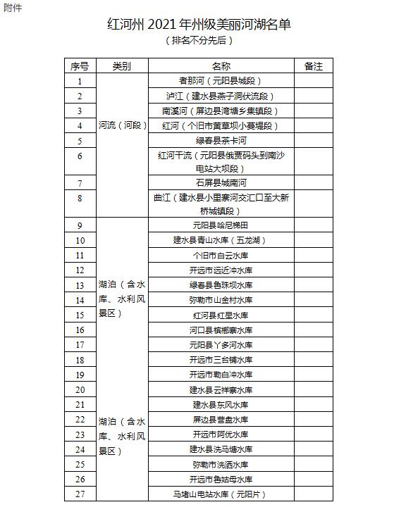 附件:红河州2021年州级“美丽河湖”名单