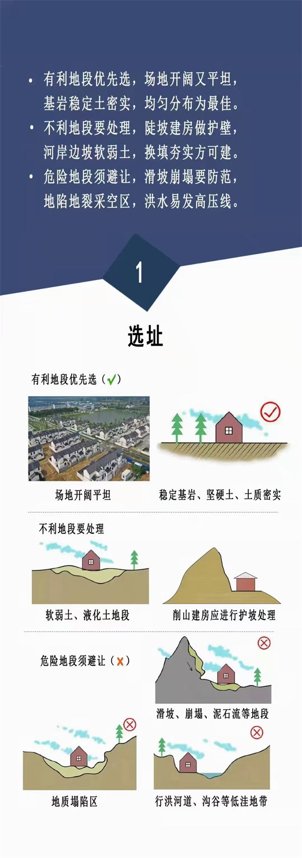 农房选址要求:应首选在适宜修建房屋的用地上建房,避免在不适宜修建房屋的用地上建房,不应在危险场地建房。