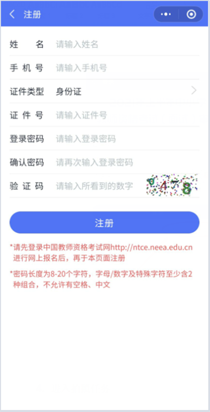 【注意:请先登录中国教师资格网http://ntce.neea.edu.cn进行网上报名后,再于本页面注册】