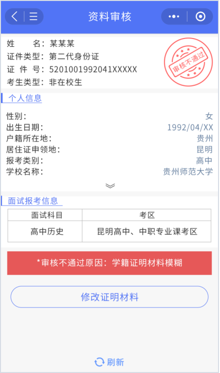 审核结论未获通过的考生请根据反馈提示在规定时间内更正信息或修正上传审核材料。
