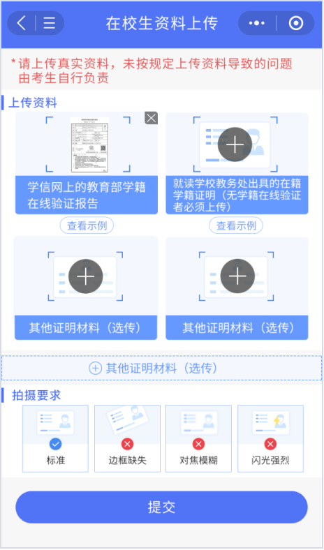 (二)请考生本着对自身负责的态度,确保上传材料完整、真实、有效、齐全、准确、清晰。如因上传材料不符合要求造成审核不通过的,责任自行承担。