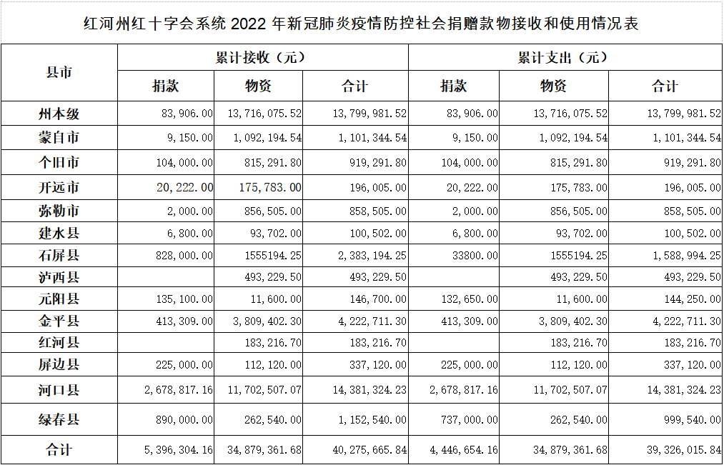 2022年1月1日至4月30日,红河州红十字会系统接收新冠肺炎疫情防控社会捐赠款物价值40275665.84元(捐款5396304.16元、捐赠物资价值34879361.68元),使用捐赠款物价值39326015.84元(捐款4446654.16元、捐赠物资价值34879361.68元)。其中,州红十字会接收新冠肺炎疫情防控社会捐赠款物价值13799981.52元(捐款83906元、捐赠物资价值13716075.52元),使用捐赠款物价值13799981.52元(捐款83906元、捐赠物资价值13716075.52元)。