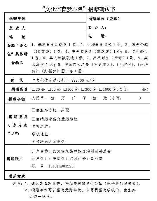 为积极推进第二个百年奋斗目标的实现,激发中华儿女爱国立志的志向,关心关爱“留守儿童”和“困境青少年”保护工作,助力贫困家庭儿童、青少年自信前行,健康、平安、科学成长。红河州慈善总会倡议在全州范围内开展“情暖童心 助力乡村振兴”为主题的公益活动,为中小学生捐赠“文化体育爱心包”公益活动。(公开募捐备案编号:515325005688349803A22002)具体筹募事宜如下∶