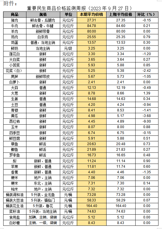 附件:重要民生商品价格监测周报(2023年9月27日)