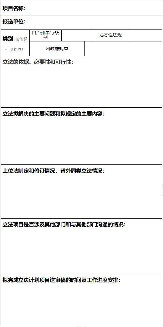 立法项目建议应当填写《红河州人民政府2024年立法计划立项建议表》(见附件),写明立法项目名称、立法的依据、可行性、合法性、主要内容等(如具备条件,可一并提出草案建议稿),并注明联系方式和通信地址。