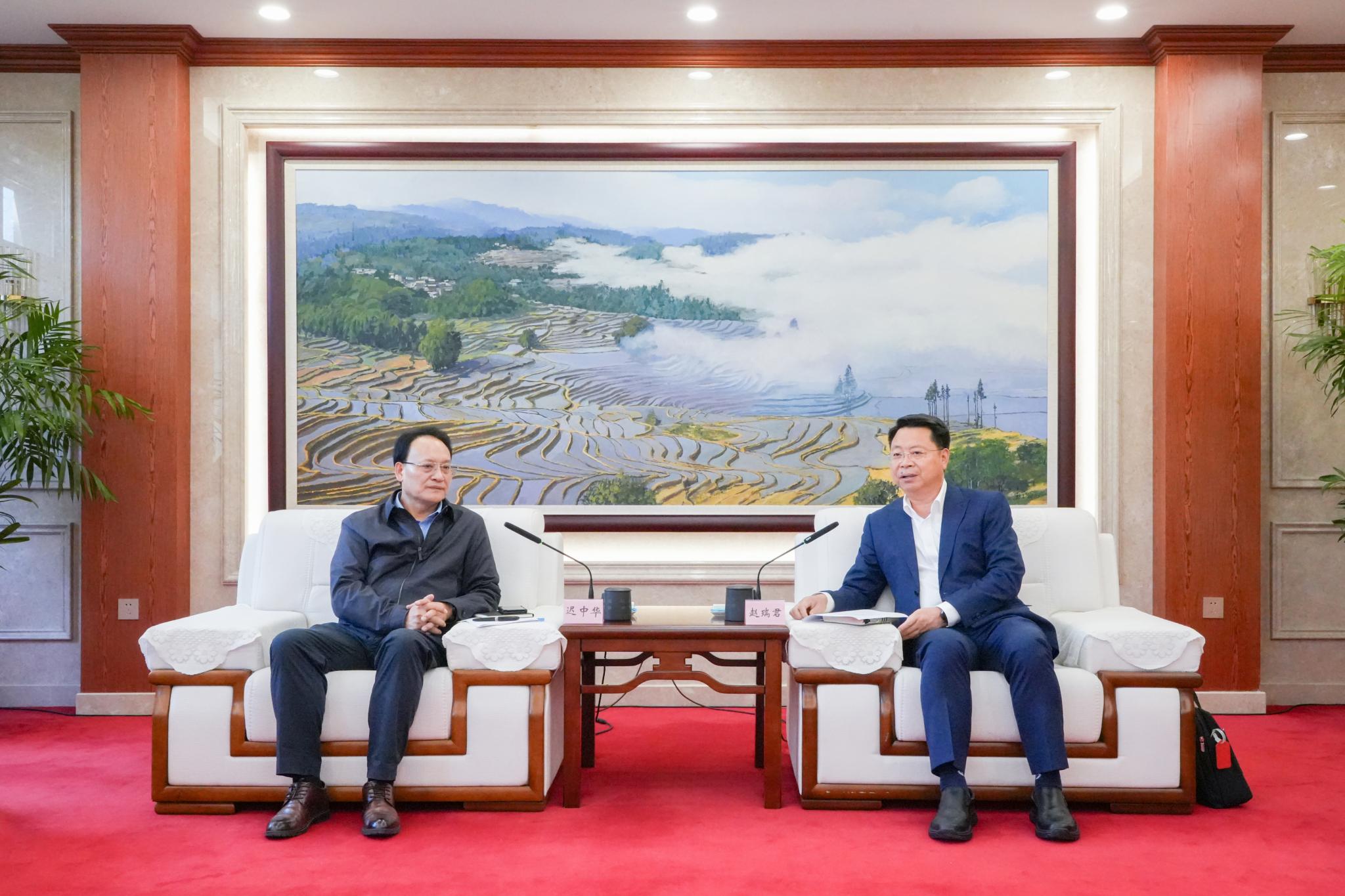 10月12日,红河州委书记赵瑞君在蒙自与云南省交通投资建设集团有限公司党委书记、董事长迟中华一行举行工作座谈,双方就进一步巩固和深化合作关系,加快推动综合交通建设等进行深入交流。