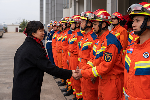 在红河州森林防火指挥部和个旧市大屯消防救援站,罗萍与在岗值守的森林防火队员和消防救援人员一一握手,送上鲜花,赞扬他们舍小家、顾大家的奉献精神和旺盛斗志,并通过红河州数字林草平台现场调度了个旧市锡城街道戈贾村等地的森林防火情况。