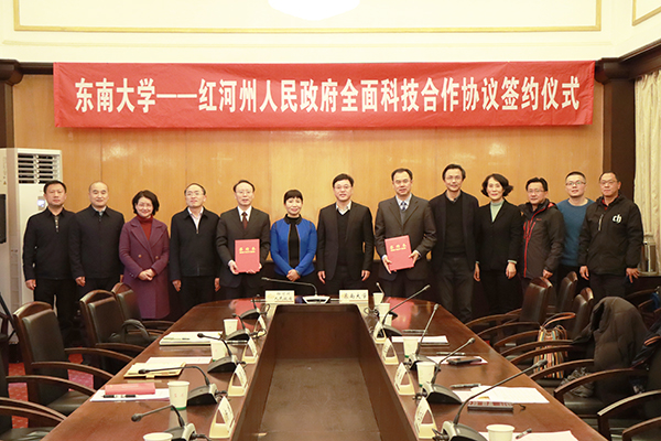 红河州科技局,东南大学科研院、研究生院、数学学院、生物科学与医学工程学院、建筑学院等负责人、教授参加签约仪式。
