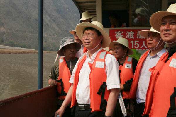 赵瑞君一行在建水县官厅镇乘船沿红河察看河流沿线矿洞封堵和防控情况