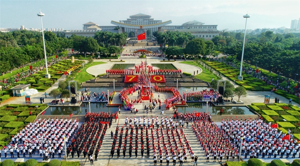 10月1日,红河州在蒙自红河会堂南广场举行庄严的升旗仪式,庆祝新中国成立70周年
