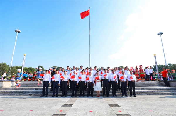 州委书记姚国华,州委副书记、州长罗萍,州委副书记、州委宣传部部长盛高举,州人大常委会主任普绍忠,州政协主席聂明等领导与全州各族各界代表一道参加升旗仪式