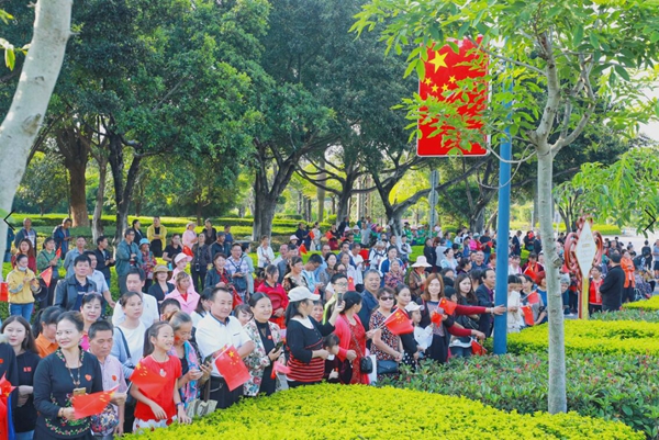 8时30分,红河会堂南广场。金色鲜花组成的“壮丽70年、奋进新时代”等大字耀眼夺目,广场周围早已人声鼎沸,各地方言在这里汇成了欢声笑语的海洋。自发前来的市民们挥舞着手中的五星红旗,庆祝新中国成立70周年。
