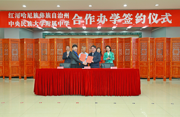 3月26日,红河州人民政府与中央民族大学附属中学合作办学签约仪式在蒙自举行。州委书记姚国华出席仪式并致辞,州委副书记、州长罗萍与中央民族大学党委常委、副校长、附属中学校长田琳出席仪式并代表校地双方签约。