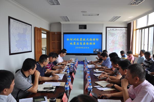 8月14日下午,红河州抗震救灾指挥部在州地震局视频指挥会议室开展地震应急桌面推演。州长、州抗震救灾指挥部指挥长罗萍出席桌面推演并讲话。