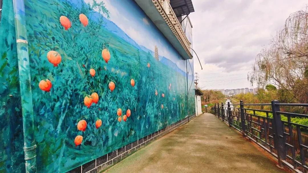 挂满枝头的石榴,把新安所的丰收与乡野气息画进了墙里