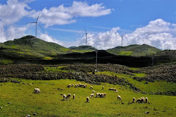 阴山也是牛羊的天然牧场。在湛蓝的天空下,清风拂过草原,风车缓慢旋转,牛羊怡然自得,时光变得慵懒,直到月上树梢,万物静寂。