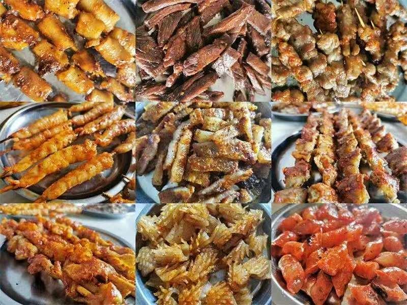 烧烤是红河夜晚永恒的话题。个旧糖粉小肉串、开远冰糖甜肠、腌制的五花肉、软糯Q弹的鸡爪、薄而嫩的翻身牛肉、嚼劲十足的大肠、馅料丰富的龙船茄子、清甜可口的草芽、小瓜等蔬菜,还有香脆的炸竹虫、蚂蚱等特色小吃,每一盘都风味独特,令人流连忘返。