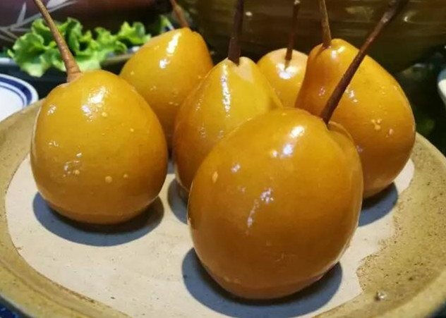 用刀把皮削开,在乌皮的相衬下,那果肉越发雪白细腻。咬一口,又酸又甜,脆而汁多,比新鲜梨有过之而无不及,让人爱极,特别是加了甘草泡出的梨,每一块果肉进口都有股回甜的滋味,让人吃完一个还想再吃一个,又因泡梨小,一次吃三四个完全没有问题。
